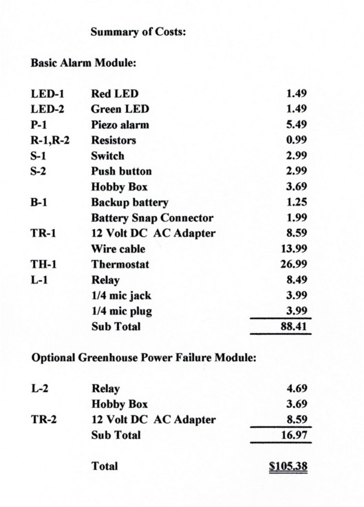 If you have a heated greenhouse and your heat fails on a cold night, you could lose a substantial number of your treasured plants. If you have a low temperature alarm system to notify you of such malfunction, you can have time to provide ancillary heat to save your plants. If you utilize all of the parts of the system described here, the cost will be just over $100, less if you don't need the Greenhouse Power Failure Module. An untimely freeze in your greenhouse can cost you far more than $100, so having such a system can be worth all the cost.